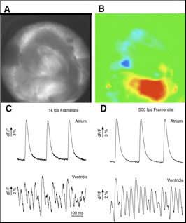 Guinea pig in VF caused by coronary block induced ischemia. The heart was perfused retrogradely with Tyrode solution heated to 37 C through the aorta on a Langendorff perfusion apparatus and was stained with calcium indicator rhod-2. The perfusate contained 20 mM DAM (diacetyl monoxime) to inhibit motion.