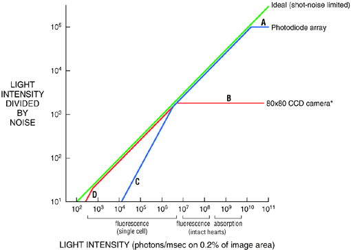 Dark noise will degrade the signal-to-noise ratio at low light levels. Because the CardioCCD is a cooled CCD camera, its dark noise is much lower than that of the CardioPDA. The excess dark noise in CardioPDA accounts for the fact that segment C (for CardioPDA) in the Figure is substantially to the right of segment D (for the CardioCCD). The dark noise of the CardioCCD is lower than other commercially available CCD's in its performance range.