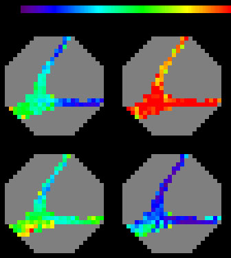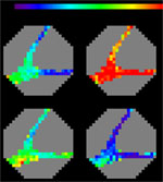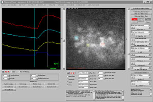 The second analysis interface within NeuroPlex provides pseudocolor displays of the data (shown at right, Enlarge). Options for pseudocolor image displays include single frame, multiple frame, and movie displays of the time series. For anatomical reference, the pseudocolor images can be overlaid on an image of the preparation. A variety of color schemes, scaling, and filtering options are available.