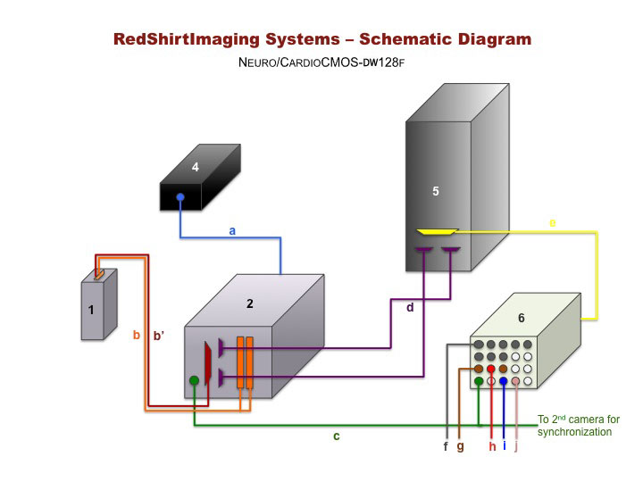 Connections: a - Power supply to camera controller. b - Cables connecting the camera head and the controller (b - command module; b' - color coded input channels). c - Clock trigger line from the control panel to camera controller. ** d - Camera controller to EDT board. e - Cable connecting Microstar A-to-D/D-to-A board to the control panel. f - 8 BNC inputs. g - Analog outputs (See Software Manual). h - External Trigger. i - TTL output that controls the shutter during data acquisition. j - TTL output that triggers stimulator at the beginning of acquisition. ** If you have two cameras and are only running one, turn the 2nd camera on or disconnect it from this line.