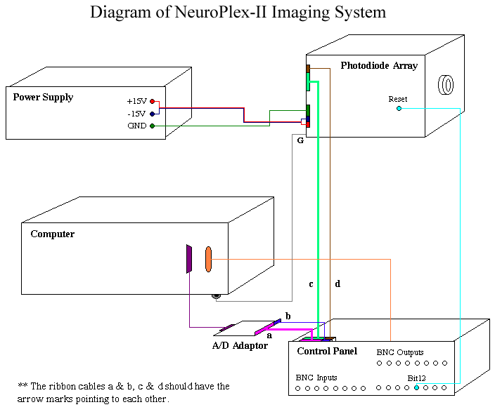 Take data using the following procedure: Install the IDL dongle on the printer port of the computer. Click on the NeuroPlex icon on the Windows NT screen to run NeuroPlex. When the NeuroPlex window is opened, use Setup >> New Page and Trace Screen Size to make the Page and Trace screens have the desired size. Do Acquire >> Photodiode Array >> Number of Points so that the trace duration is about 1 sec. Then Go >> OK >> Start to take data. Some of the LED indicators on the left side of the panel should blink according to the data acquisition sequence. This indicates the computer, the program, the A/D card, and the Output-control panel are working properly. Next use a signal generator to provide a known signal of about 50 Hz to one of the BNC inputs on the right side of the panel. Take data again. Using Page Display >> Traces, you should see the appropriate signal on one of the BNC traces on the upper left and right of the Page Display window. This indicates that BNC inputs are working properly.